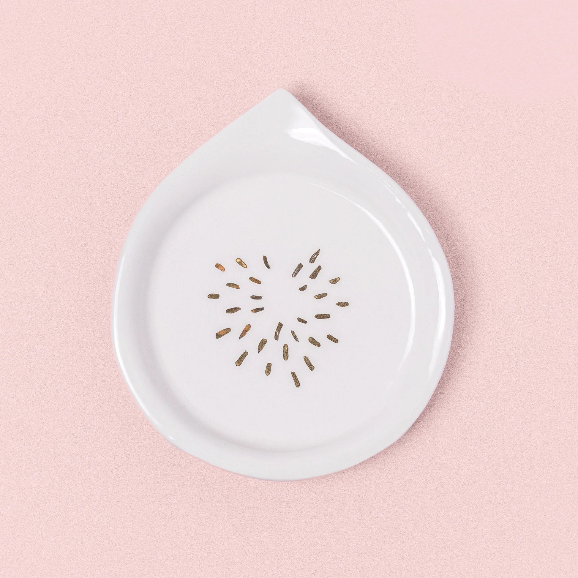 Inspirée par la fluidité d’une goutte d’eau, cette assiette en céramique incarne la pureté et la délicatesse. Son design minimaliste est sublimé par de fins grains dorés à l’or 24K, pour une touche de luxe discrète et raffinée.